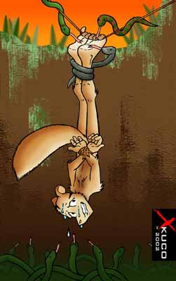 Egger tried to scare the snakes away waving his tail at them, but it wasn't long enough to make any difference. Suddenly, he felt a shock of ticklishness over his left sole as one of the snakes was darting its tongue over the helpless chipmunk sole. Egger coughed out a giggle. Then, another snakey tongue darted over the toes on his right sole. Egger giggled, closing his eyes and trying desperately to hold onto the rope with his tender ticklish toes. The black constrictor seemed terribly devious, tightening its grip around Egger's ankles, keeping them together and slowly licking his arches.