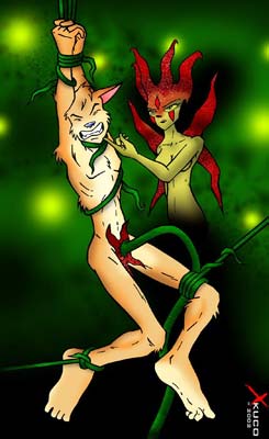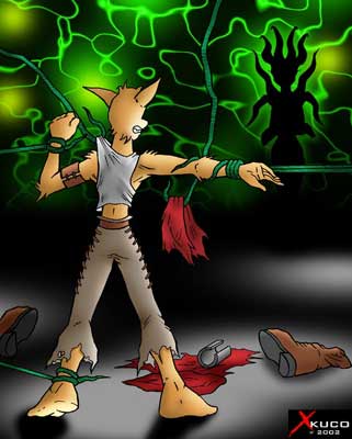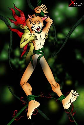 Lance spat at one of the vines. It hissed back at him and began to tear through his shirt like it was made of paper. More vines assaulted the bound coyote, going under his belt and pants, tearing through all of his clothes, leaving him nearly naked and exposed. Lance growled and struggled as the dark shape moved closer and started to become clearer. Lance felt more vines from overhead slither down, grab his bound wrists and pulled his arms over his head. He was helpless to defend himself. His nearly naked body now bound by vines, he felt the cold dankness of this place start to envelope his defenselessness. Lance felt some of the vines start to wrap around his muzzle, forming a green gag. He tried to bite through the sinister vines, but the vines were as hard as iron.