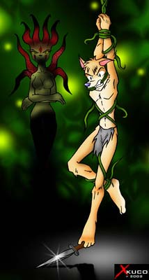 Lance looked into her eyes, very weak from his ordeal. The Dark Queen released the tired warrior from the grips of her vines. Lance was not a threat to her in his weakened state. The weakened coyote caught a glimpse of where his shining dagger blade came to rest. It was just a few feet away. The Dark Queen forced Lance into a submissive kneeling position facing the Queen.